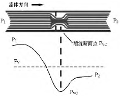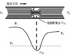 圖1為液體流經調節閥時壓力和流速間的關系圖示。圖中P1為閥前液體壓力,P2為閥后液體壓力,V1為閥前液體速度,V2為閥后液體速度,PVC為縮流斷面點處液體壓力。