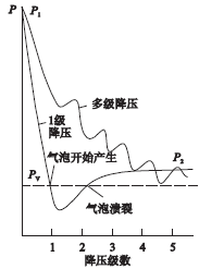 高壓液體流經(jīng)節(jié)流孔時,閥座相當(dāng)于節(jié)流孔板(圖4),靜壓能與動壓能相互轉(zhuǎn)換,流速的增加導(dǎo)致壓力降低。當(dāng)壓力降低至等于或低于該液體在入口溫度下的汽化壓力PV時,液體中的氣核即膨脹而形成汽泡。流過節(jié)流面后,在寬敞的下游流道中流速下降,壓力回升。當(dāng)壓力回升至P2時,并≥PV時,汽泡潰裂,這即是汽化過程。汽泡潰裂時,釋放出巨大的能量,對閥座、閥瓣等節(jié)流元件產(chǎn)生破壞即汽蝕。汽蝕的破壞力很大,一般的閥門在汽化條件下,運行一定時間后即遭受嚴重汽蝕,致使閥座泄漏量高達額定流量的30%以上,調(diào)節(jié)閥完全喪失調(diào)節(jié)控制功能。