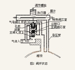 如圖2所示,氮封閥打開時,當儲罐壓力稍微低于設定壓力時,膜片因為感應壓力下降而向下移動,推動氣導閥打開,氮氣經過孔板、氣導閥的出口進入儲罐,使儲罐內的壓力增加,同時氣導閥的特殊閥芯室的壓力下降,氮氣通過內部通道從特殊閥芯室進入主閥閥芯室。由于主閥閥芯的活塞面積大于主閥閥座孔面積,并有彈簧的彈力和主閥的重量,所以當儲罐壓力稍微低于設定點時,特殊閥芯室和主閥閥芯室的壓力降低很小,主閥仍然保持關閉,氮氣只從氣導閥進入儲罐。